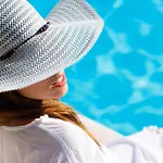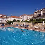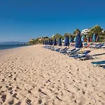 A Skala városi hotelnek van egy homokos strandterülete napernyőkkel.